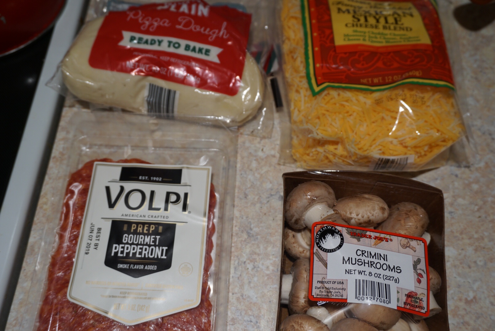 ペパロニ、マッシュルーム、チーズ、ピザ生地、トマトソース。