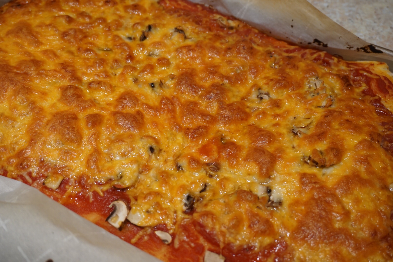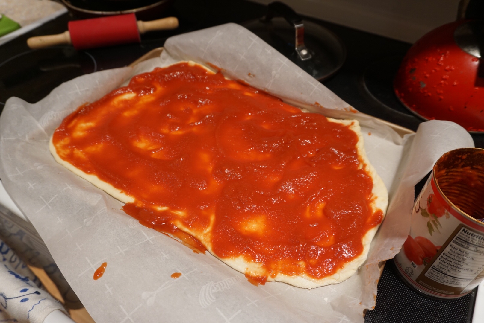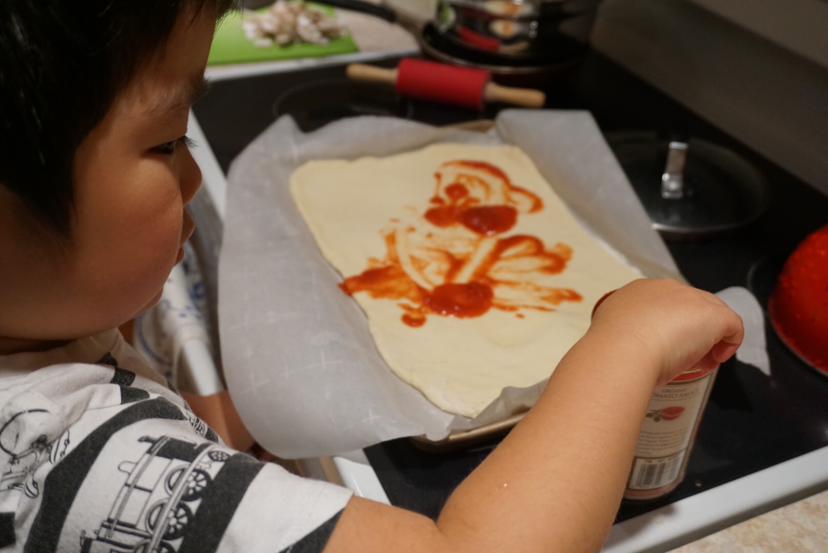 息子曰く、生地が見えなくなるほどトマトソースを塗りたくるそうです。