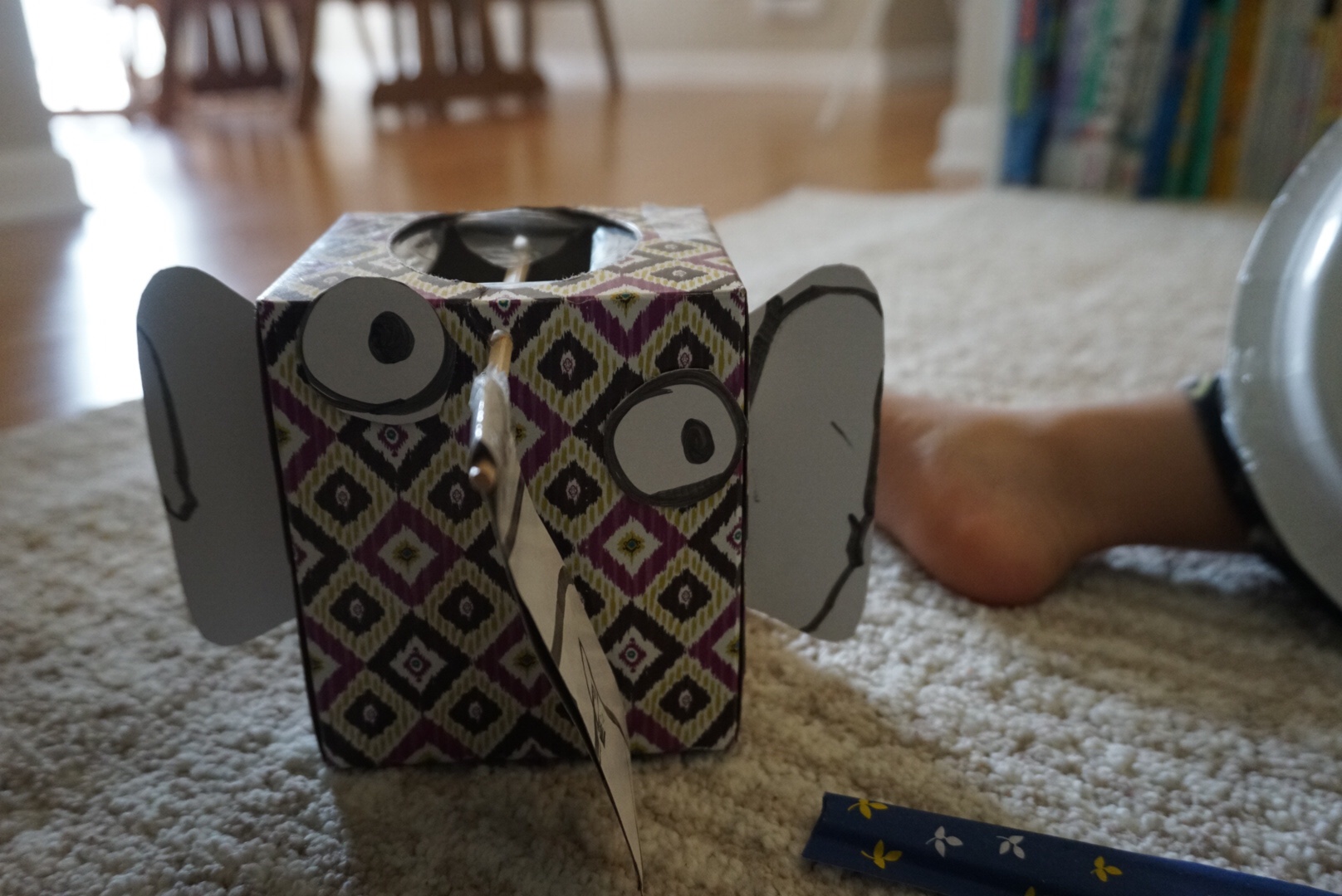 次に、ティッシュ箱に穴を開けて、割り箸を通します。