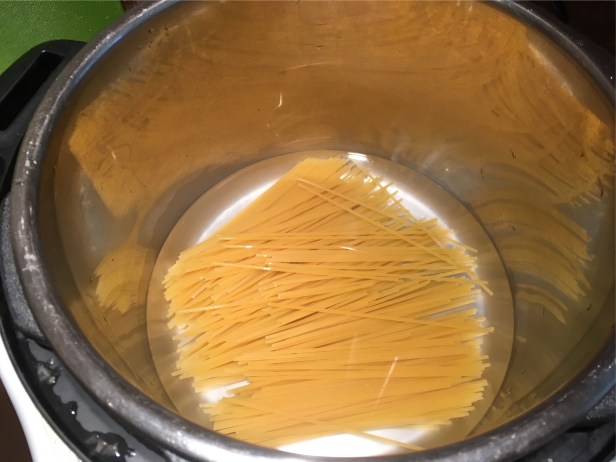 パスタはそのままだとインスタントポットには入らないかもしれませんので、半分におっても問題なし。