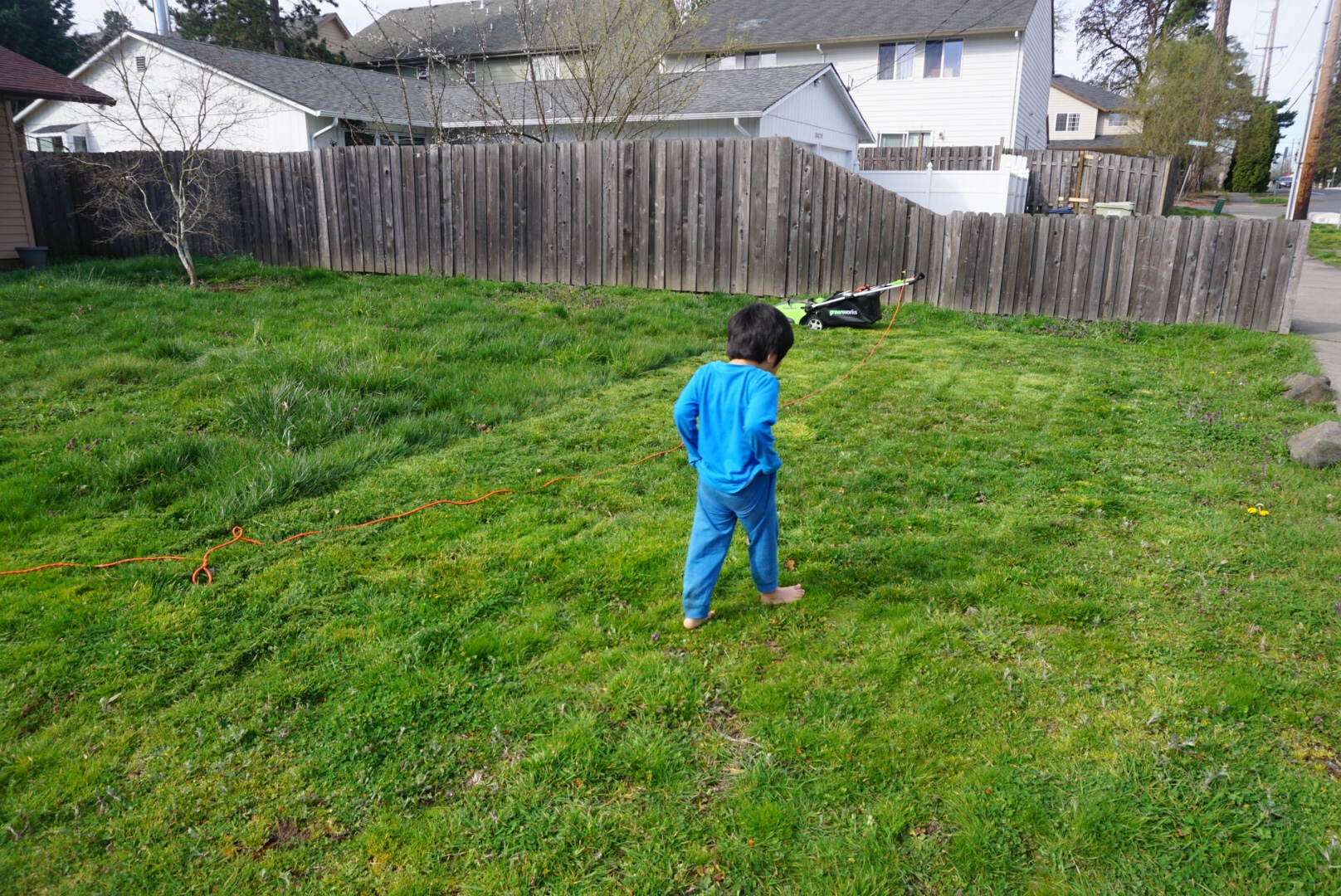 amazon.comのレビューを読んでいると、バッテリーがすぐに劣化するとか、バッテリーを何度も交換しないと庭全体をカバーできない、とか書いてあり、コードの電動芝刈り機にした次第です。