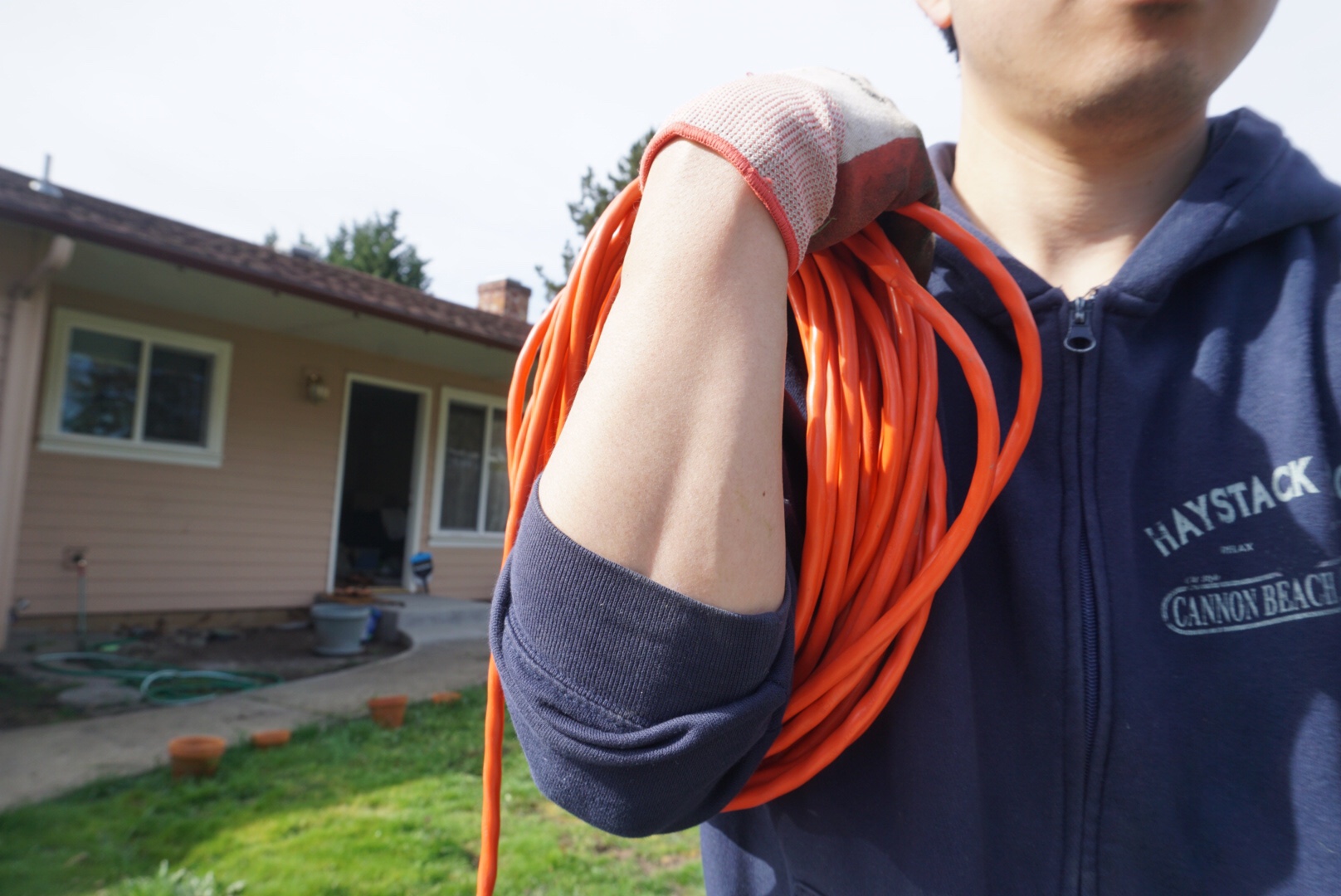 50ftの電気コードを2本つなげてやっと庭全体をカバーできる程度。