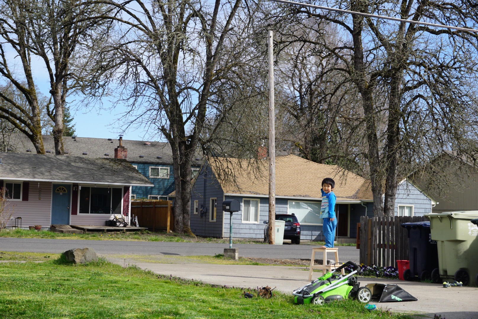 息子と一緒に芝刈り機を押すのが結構大変です。