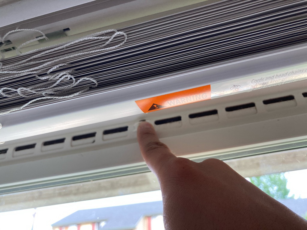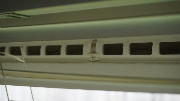 ブラインドを上げるときれいに隠れるこの窓枠の上の部分。