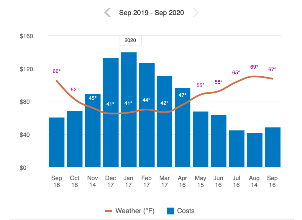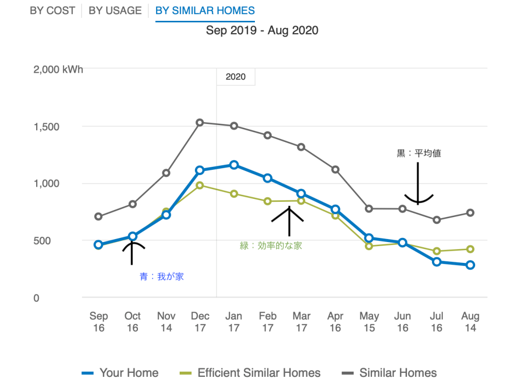 ↓ のグラフは、他の世帯の電気代の平均値(1000sqftサイズ)と比べたもの。