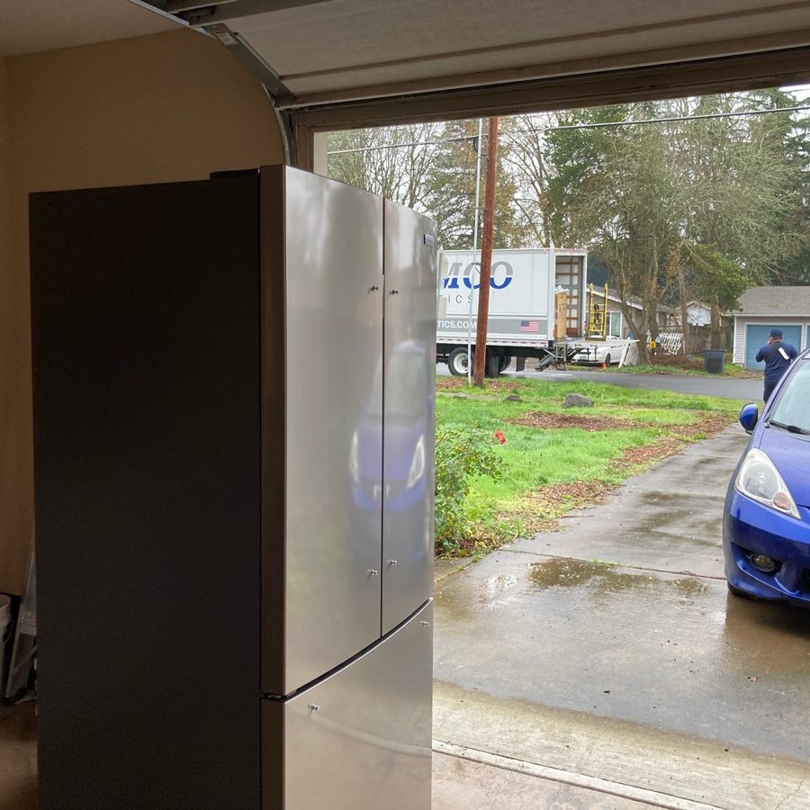 というわけで、新しい冷蔵庫はガレージにおかれ、配達業者のおっちゃんは去って行きました。