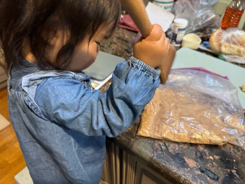 手伝うと言っても、ディッシュウォッシャーから綺麗なフォークやスプーンを取ってくれたり。 チーズケーキの生地作りのクラッカーを一緒に叩いてくれたり、という程度ですが。